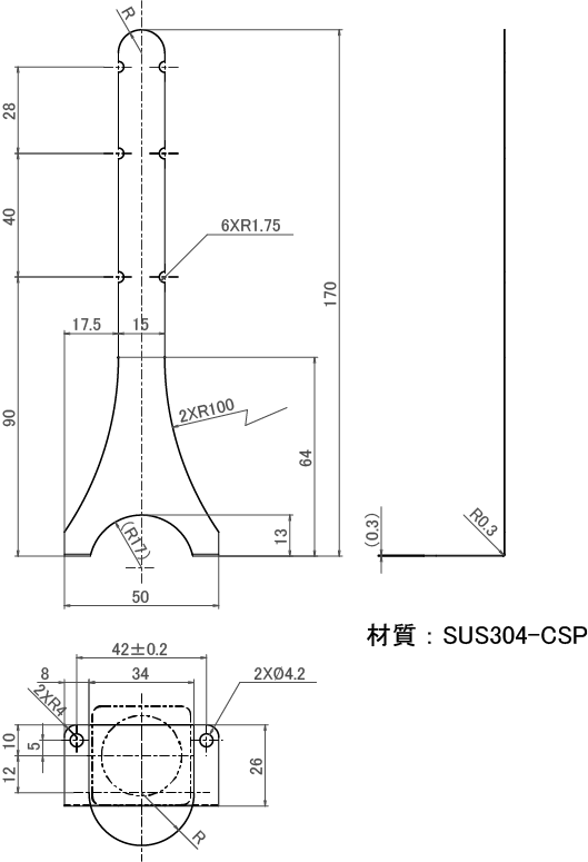 配線・配管用のステーをロボット本体に取り付ける場合は、第2軸アームコネクタプレート部にある既設ねじ穴(2個)を利用し、固定してください。この場合、下図を参考にしてステーを製作してください。