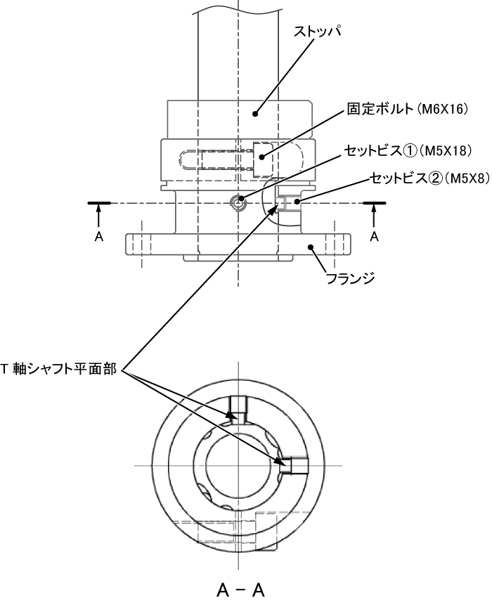 - フランジをストッパ端に当たる位置まで押しあて、フランジを回転させてセットビスの位置をT軸シャフト平面部に合わせてください。