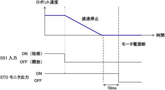 - SS1入力の2経路の状態が約0.5秒以上異なる場合は、何らかの異常があったと判断し、エラーが発生しモータ電源が切れます。