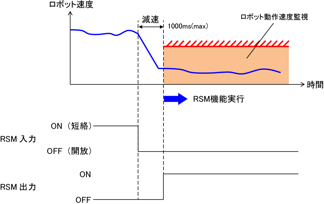 - 自動モードにおいてRSM入力をOFF(開放)にすることにより、外部機器からRSM機能を実行します。ロボットを減速し、規定速度制限値を超えていないことを監視します。