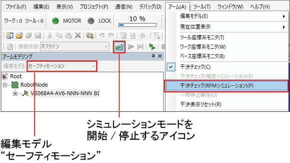 - 編集モデルが「セーフティモーション」になっている状態でシミュレーションモードを実行する。