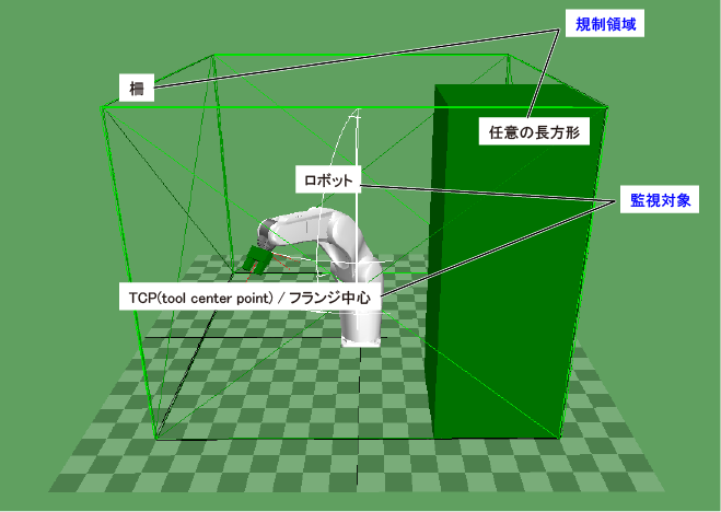 | 規制領域 | 常時 | 柵モデル | 監視対象が領域内か常に監視します。ロボットを囲っている必要があります。 |
