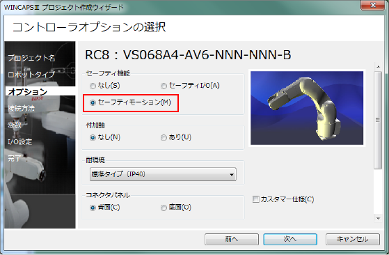 プロジェクト作成時の「コントローラのオプション選択」で、セーフティ機能の「セーフティモーション」を選択します。