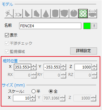 フェンスの位置やサイズは、[相対位置]や[サイズ(mm)]で変更可能です。