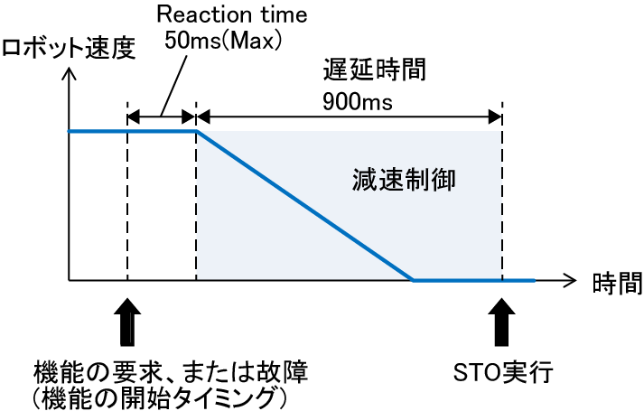 ロボットを減速停止し、停止が確認できる一定時間が経過したら、STO機能を実行し、ロボット本体のモータ電源をOFFする機能です。