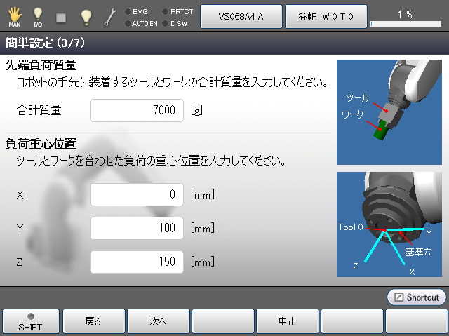 「先端負荷質量」と「負荷重心位置」の設定を行います。