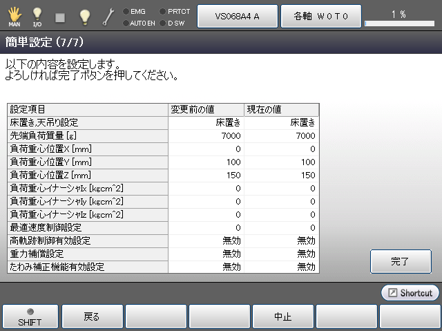 設定した内容を確認して[完了]を押します。今まで設定した各項目の値がコントローラに保存されます。