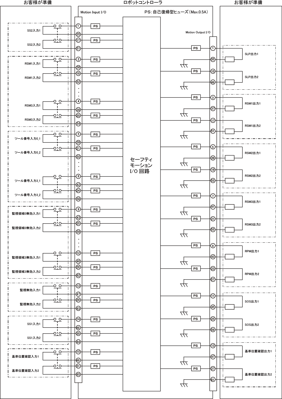 コントローラの安全回路(セーフティモーション)の内部接続等価回路を下図に示します。