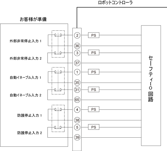 - 2つの防護停止入力、2つの自動イネーブル入力は別々の接点で制御してください。1つの接点での「2回路並列接続」または「1回路常時短絡」は外部回路異常と判断し動作できません。