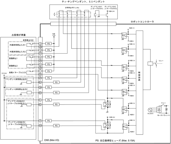 ロボットコントローラの非常停止の回路構成と接続例を以下に示します。