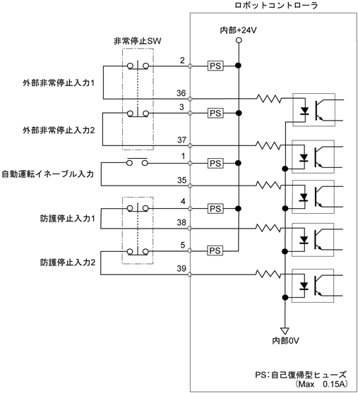 外部非常停止と自動イネーブルの信号は、安全のために重要な信号です。下図に示すように、必ず有接点の回路で構成してください。
