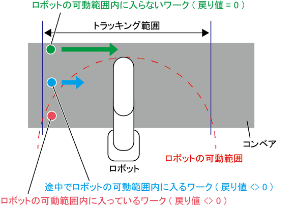トラッキング範囲内にトラッキング対象ワークがいた際における作業動作の目標位置の中に、ロボットの可動範囲内に入る点があるかどうかを、整数型データで返します。
