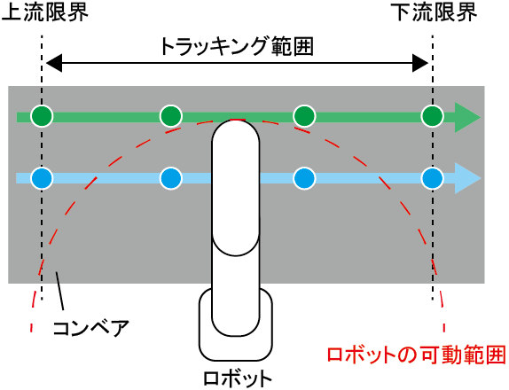 TrackMotionRangeコマンドは、トラッキング範囲内にトラッキング対象ワークがいた際における作業動作の目標位置の軌道上に、ロボットの可動範囲内に入る点があるかどうかをチェックします。