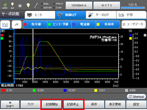 操作経路:[F2 アーム] - [F3 サーボ状態] - [制御ログ タブ]