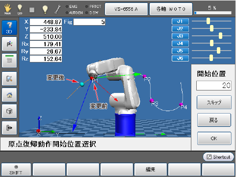 原点復帰の制御ログの最終位置とロボットの現在位置が異なる場合は、原点復帰動作の軌道上の点の中から最短かつ、4~6軸の変位量が少ない点を開始点として軌道が生成されます。