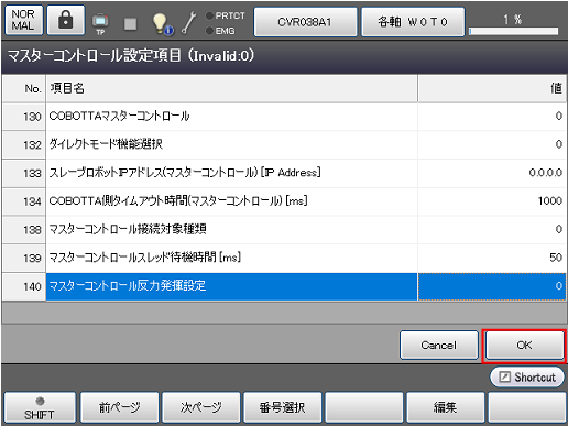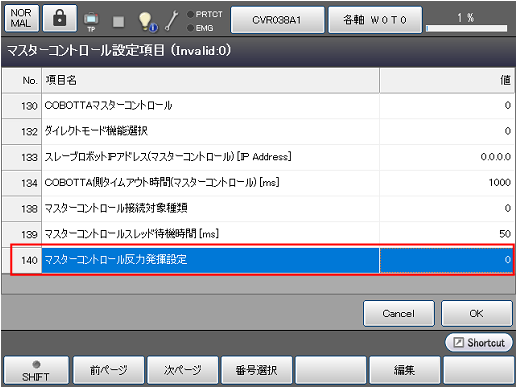 マスターコントロール設定項目画面でNo.140[マスターコントロール反力発揮設定]を選択し、[F5 編集]を押します。