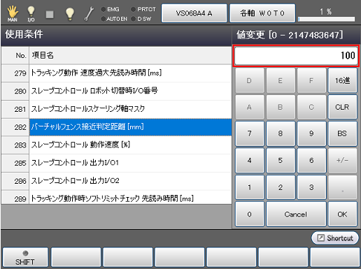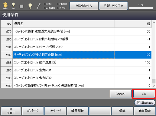 使用条件画面でNo.282[バーチャルフェンス接近判定距離]を選択し、[F5 編集]をクリックします。