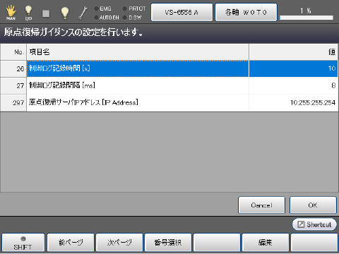 制御ログ記録時間、制御ログ記録間隔、原点復帰サーバIPアドレスを設定してください。