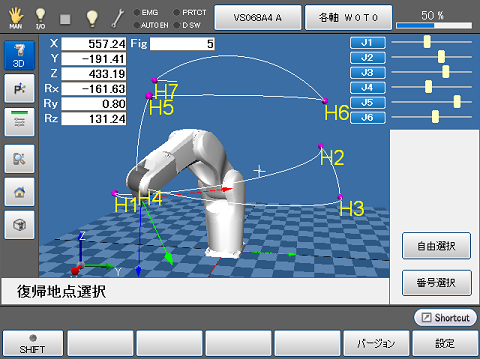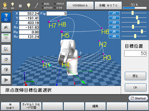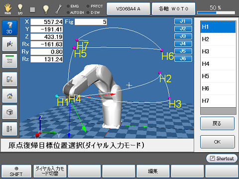「自由選択」または「番号選択」のボタンを押すと、原点復帰目標位置選択画面に切り替わります。