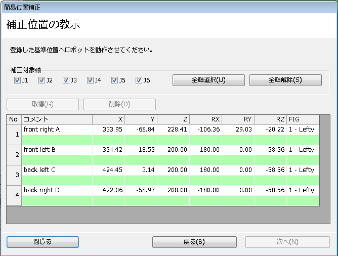 補正精度とはティーチングの精度を示す値です。計算された各軸補正値にした場合、登録されている基準位置データのずれ量の最大値です。単位はmmです。 基準位置を多く登録すると大きくなる傾向にあります。