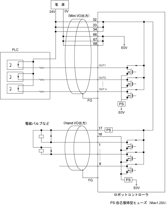 ロボットコントローラの汎用出力・専用出力・ハンド出力の回路構成と接続例を、下図に示します。