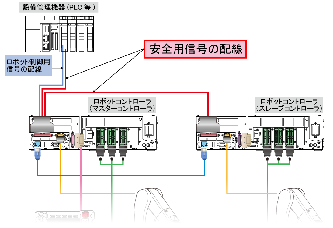 連動させるロボットが2台であれば、マスターコントローラの安全用信号を、直接スレーブコントローラに接続することができるので、回路構成を簡単なものにすることができます(一部リレーを使用)。