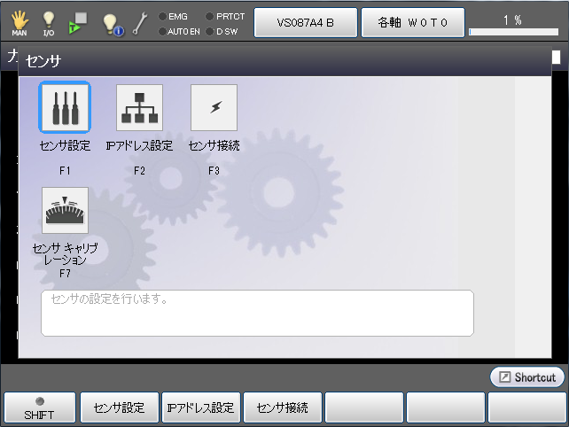 | [F1 センサ設定] | 力センサ本体の設定および、力センサの座標系を設定します。詳しい設定内容は機能ガイドの「センサの設定」を参照してください。 |