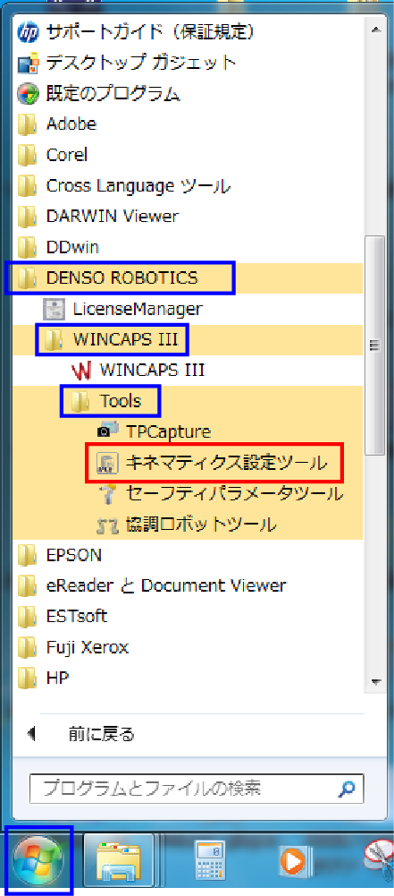 操作経路:PC[スタート]ボタン - [すべてのプログラム] - [DENSO ROBOTICS] - [WINCAPSIII] - [Tools] - [キネマティクス設定ツール]