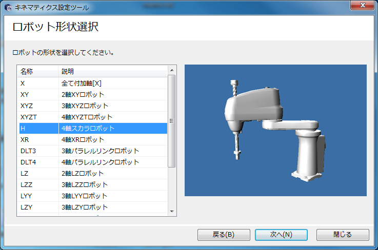 動作させたいロボットの形状を選択し、[次へ]を押します。