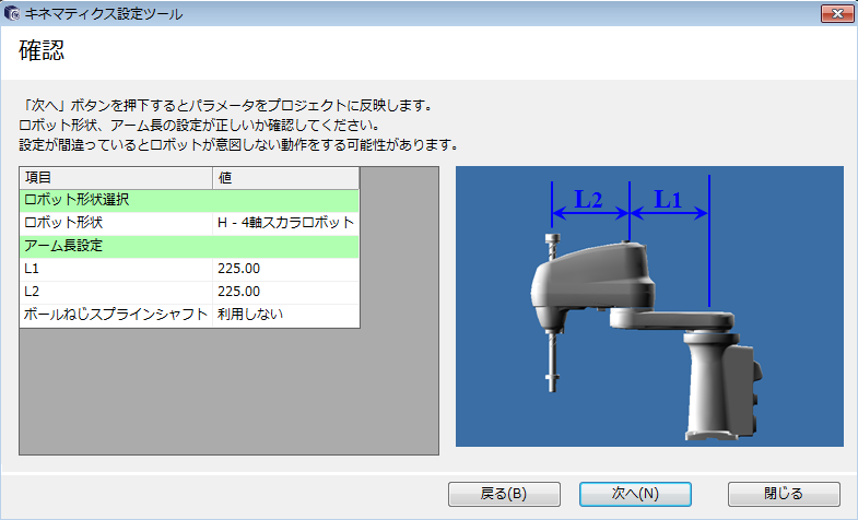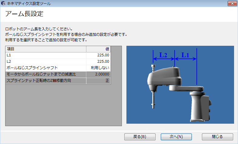 選択したロボットタイプに応じてアーム長を設定し、[次へ]を押します。