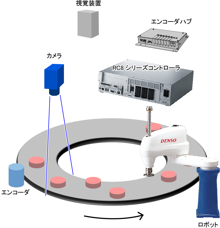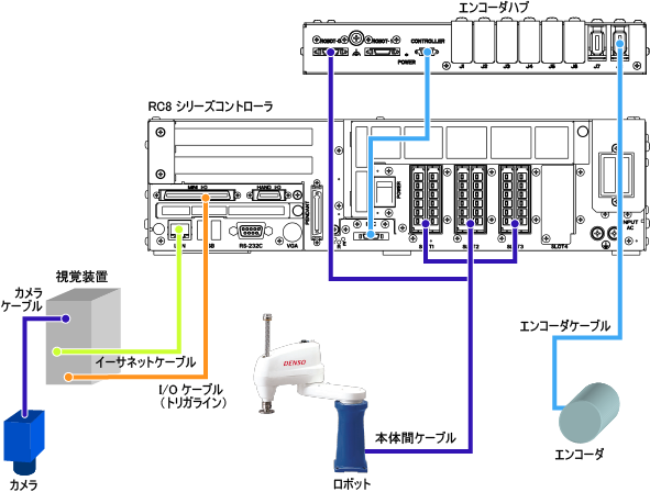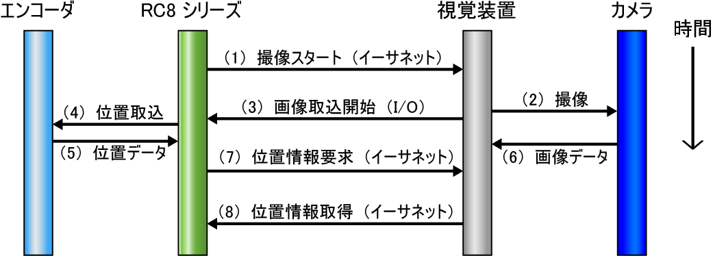 視覚装置は、撮像を開始すると同時にコントローラに開始のトリガ信号を送ります。コントローラは、視覚装置からのトリガ信号を受けると、エンコーダより位置データを取り込みます。