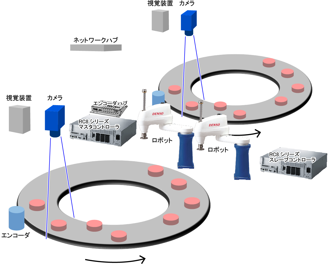 ターンテーブル2台、ロボット2台以上の構成