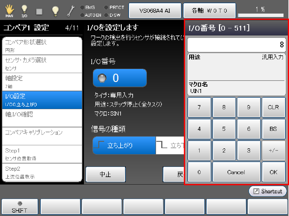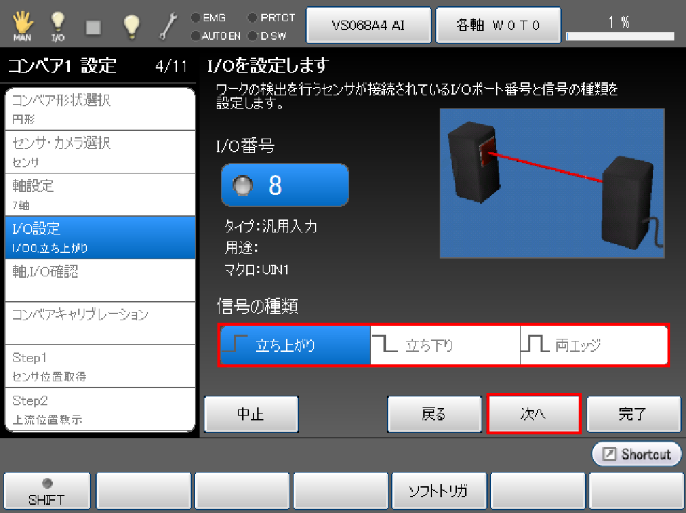 ワークの検出を行なうセンサが接続されているI/Oポート番号と、信号の種類を設定します。