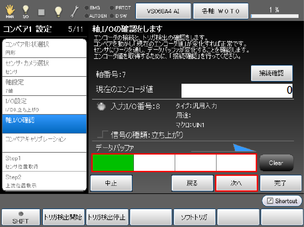 センサにワークを通し、[データバッファ]が変化することを確認します。