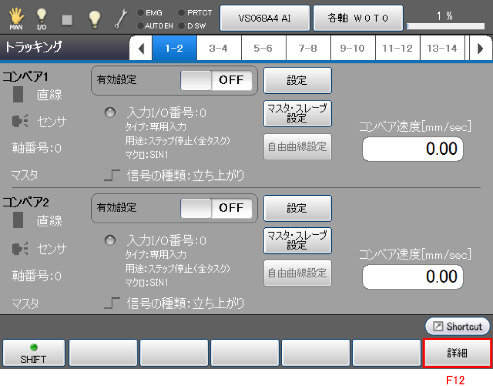 | 速度比例ゲイン | ターンテーブルの速度を上げた際に、ロボットの追従精度が悪化する場合に使用します。 ロボットがワークに追いつけない場合は、値を1より大きくしてください。 ロボットがワークを追い越す場合は、値を1よりも小さくしてください。 |
