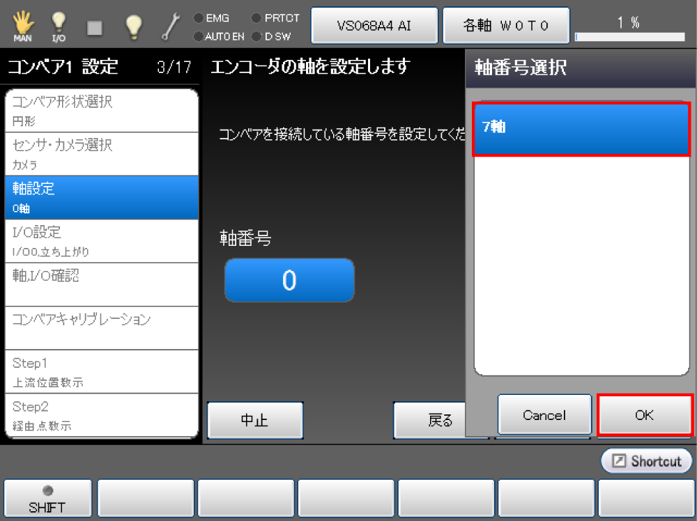 ターンテーブルに接続しているエンコーダの軸番号を「コンベア設定」画面で設定します。