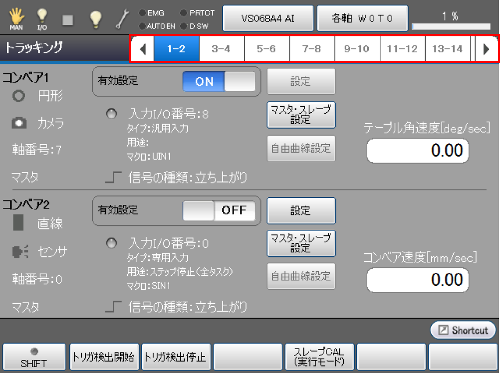 「トラッキング」画面において、画面上部にあるコンベア番号タブの内、使用したいコンベア番号が表示されているタブを選択します。
