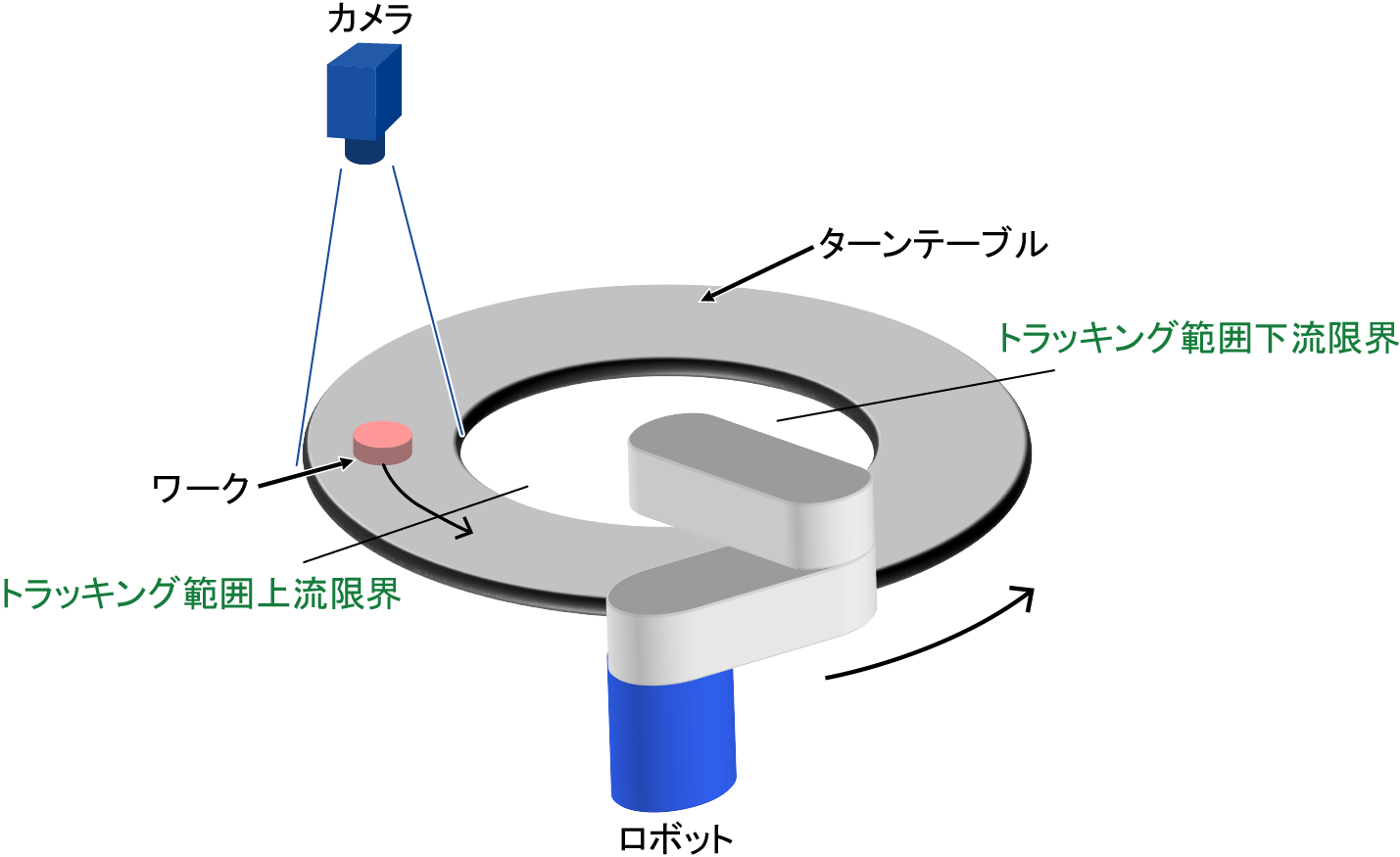 ターンテーブルと等速になるように追従動作を行いながら、トラッキング対象ワークへ近づきます。