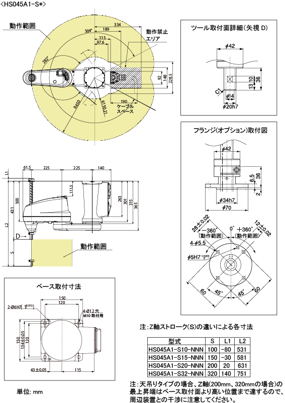 HS045A1-S*-NNN:アーム長450mm 天吊り 標準タイプ