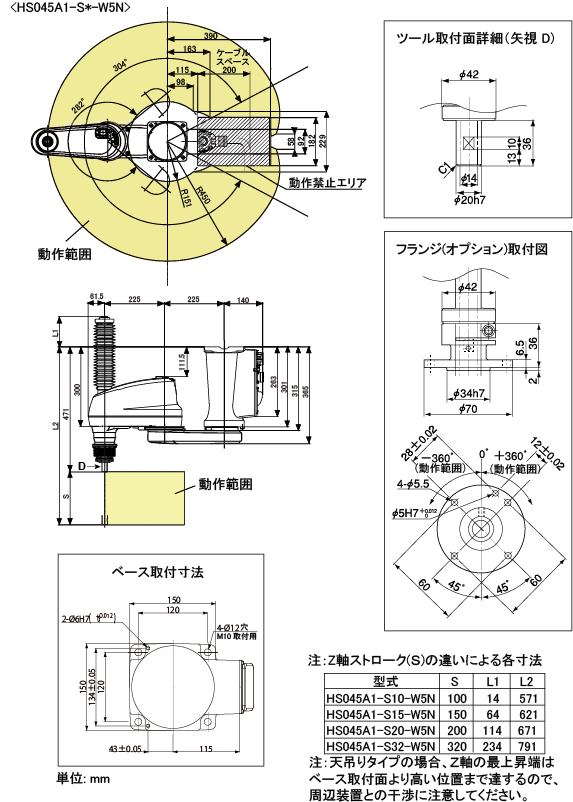 HS045A1-S*-W5N:アーム長450mm 天吊り 防塵防滴タイプ