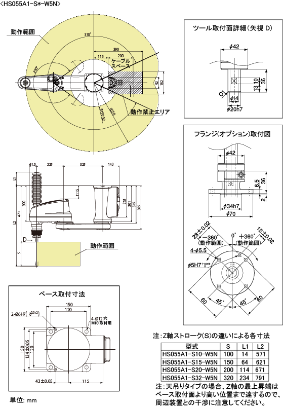 HS055A1-S*-W5N:アーム長550mm 天吊り 防塵防滴タイプ