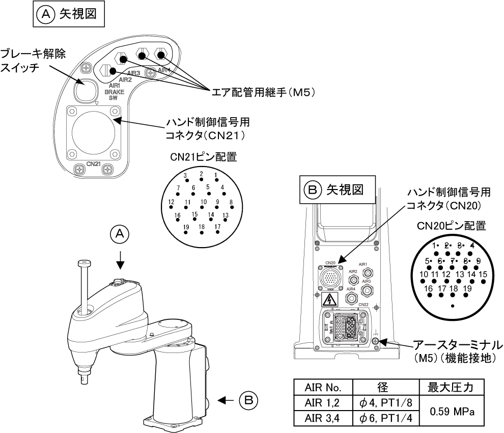 注1:CN21のピン番号1~19とCN20のピン番号1~19は同じピン番号間が接続されています。許容電流は1ラインあたり1Aです。 注2:CN20、CN21には付属のコネクタセットをお使いください。 |