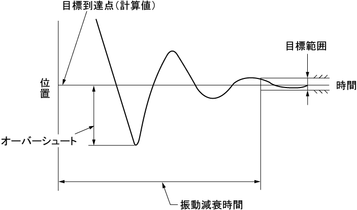 - ロボットを位置決め目標点に向かって動作させると目標到達点を越えたあと、下図のように振動が減衰し目標点に位置決めされます。この振動減衰時間はグラフに考慮されていません。