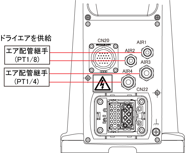 ロボット本体にはハンド制御用のエア配管が4系統(φ4×2・φ6×2)設けられています。1次側の最大供給圧力を下に示します。