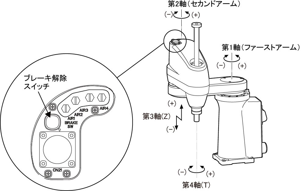挟み込まれ・非常停止時、モータOFFのまま各軸を動かす方法を下表に示します。なお、第3軸(Z)・第4軸(T)は、ブレーキ付ですのでブレーキ解除の操作が必要です。