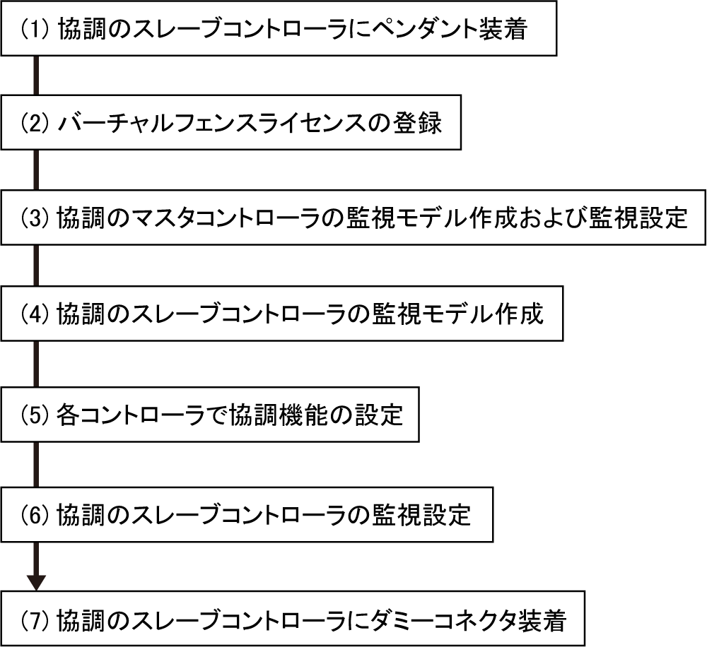 スレーブコントローラに装着してあるペンダントをはずし、ダミーコネクタを装着後、協調のマスタ/スレーブコントローラの電源を同時にONします。起動後、バーチャルフェンス機能と協調機能が有効になります。