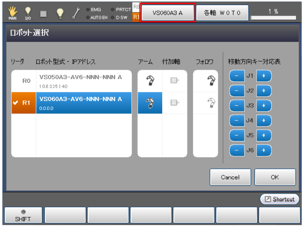画面上部の「ロボット選択ボタン」を押すと、下図のような「ロボット選択」画面が開きますので、[R1](協調のスレーブコントローラ)を選択し、[OK]を押します。