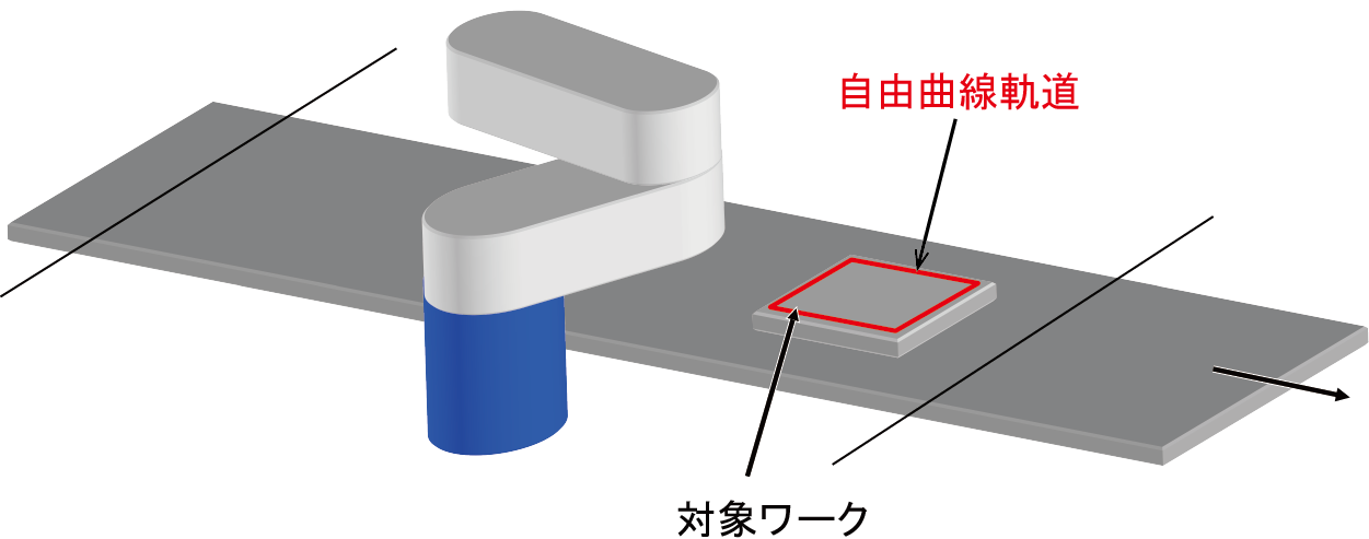 コンベアで運ばれてくるトラッキング対象ワークを追従しながら自由曲線補間動作を行うことができます。