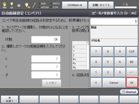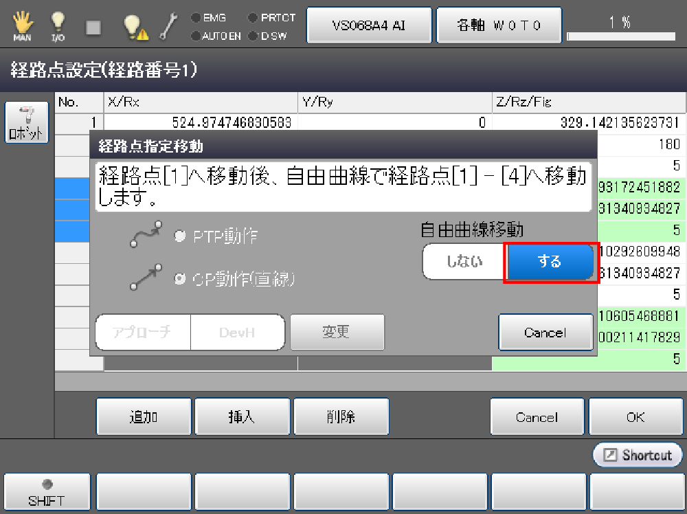 経路点[1]まで移動後、設定した全ての経路点を自由曲線補間で移動します。ペンダントのデッドマンスイッチを押しながら、OKキーを押し続けてください。