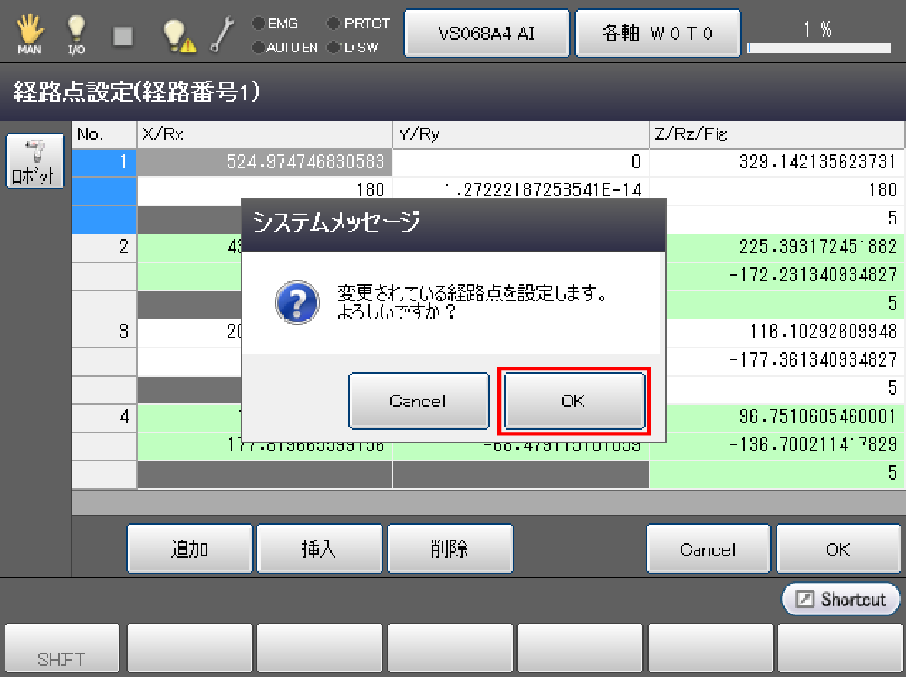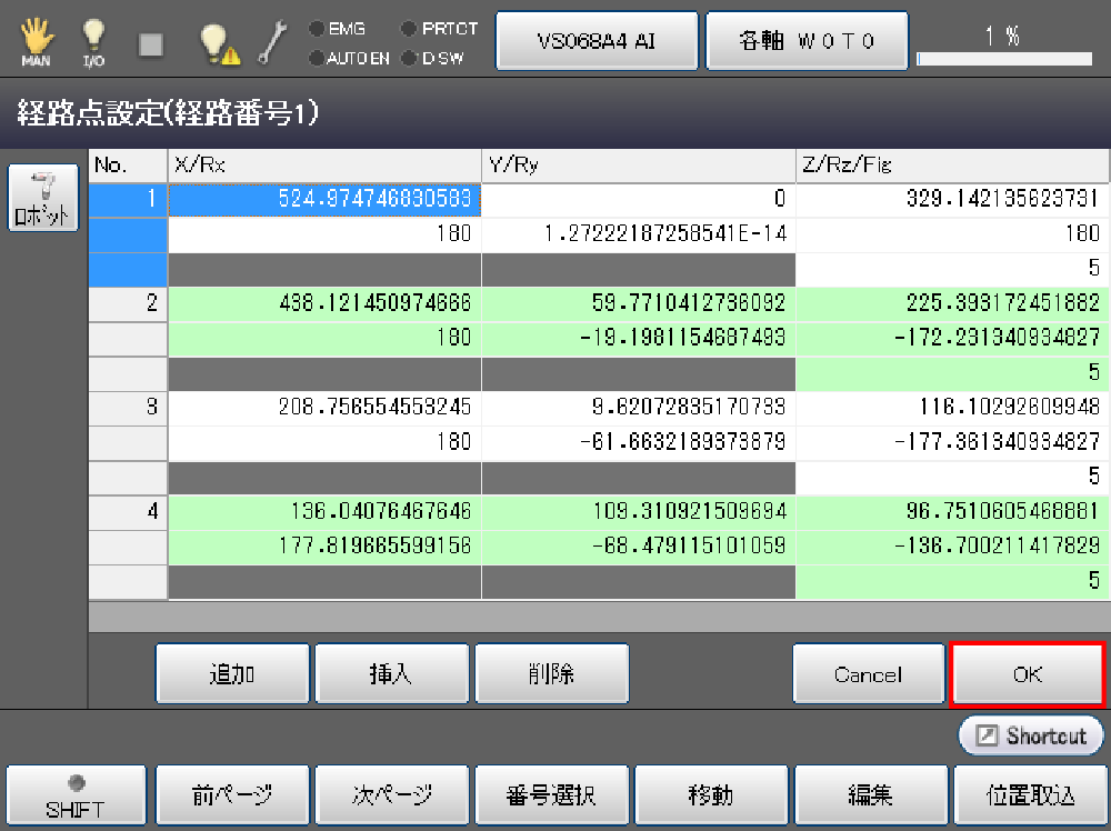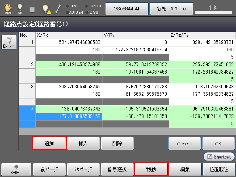全ての経路点を教示したら、[F4 移動]で経路点の確認をします。